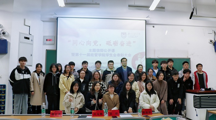 12月3日,申搏sunbet“同心向党,砥砺奋进”主题信仰公开课暨第十一届员工会表彰大会在厚学楼200举行。公司党委副书记岳克勤、分团委书记张倩、辅导员蒋海蓉和仲宏伟、员工会代表等百余位师生参加会议。