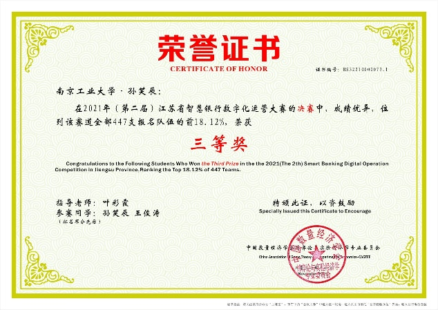 2021年11月27日,由江苏省高等教育学会指导、中国数量经济学会博弈论与实验经济学专业委员会主办、常熟理工公司承办的2021年(第二届)江苏省智慧银行数字化运营大赛(已被江苏省高等教育学会认定为“省级赛事”)落下帷幕。公司金融系积极组织员工参与,经过校内选拔、初赛,共有2支队伍进入决赛并荣获佳绩。金融19级徐涛、李凰、国贸20级朱磊磊(指导老师:庄雷)团队荣获大赛一等奖,金融19级孙笑辰、王俊涛(指导老师:叶彩霞)团队荣获大赛三等奖。