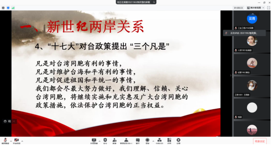 首先焦若雪同学分享了习近平总书记在纪念辛亥革命110周年大会上的讲话,总书记强调了中国人民捍卫国家主权和领土完整的坚强决心,随后与同学们一起学习了新世纪两岸关系,呼吁当代老员工要为促进祖国统一和中华民族伟大复兴不断作出新的历史性贡献。