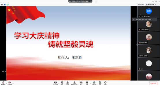 庄琪胜同学带领大家了解了大庆精神形成的历史背景,分享了老党员外公受大庆代表人物王进喜深刻影响的入党故事。60多年来,几代大庆人艰苦创业、接力奋斗,大力弘扬大庆精神,赓续红色血脉,创造了令世人瞩目的辉煌业绩。