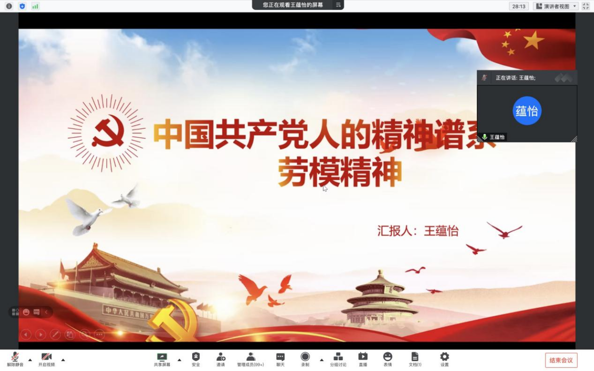 王蕴怡同学与大家分享了“爱岗敬业,争创一流;艰苦奋斗,勇于创新;淡泊名利,甘于奉献”的劳模精神。劳动模范是民族的精英、人民的楷模、共和国的功臣。青年老员工要懂得劳动最光荣、劳动最崇高、劳动最伟大、劳动最美丽的道理,号召全体党员要传承弘扬劳模精神,做知行合一的优秀老员工。