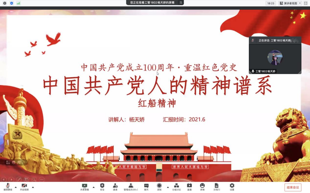 杨天娇同学讲述了题为“中国共产党人的精神谱系——红船精神”的微党课。红船精神形成于国家内忧外患、广大人民处于水深火热、中华民族面临生死存亡的历史时空中。红船精神是中国革命精神之源,昭示着中国共产党的决心,也是新时代坚持和发展中国特色社会主义的坚强精神支撑。青年老员工要牢记红船初创的伟大和艰辛,争做新时代青年。