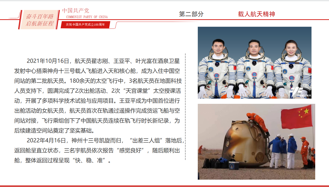 航天追梦人,赤心贯苍穹。冯洁玉同学带领大家回顾航天逐梦之旅,翻开中国航天发展历史画卷,一代又一代航天人“接力式”努力,铸就了特别能吃苦、特别能战斗、特别能攻关、特别能奉献的载人航天精神,展示了伟大的中国道路、中国精神、中国力量。冯洁玉同学号召大家弘扬和传承载人航天精神,直面问题、迎难而上,肩负起时代赋予的重任,做强国一代新青年。