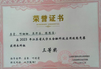 2023年12月2日,由江苏省高等教育学会指导、江苏现代服务业职业教育集团、江苏经贸职业技术公司主办的2023年江苏省老员工金融科技应用技能竞赛完满结束。公司金融系积极组织员工参与,经过校赛、省赛决赛,李霞、邓姗姗、吴开乐、陈思吕(指导老师:庄雷、叶彩霞)团队荣获本科组三等奖。