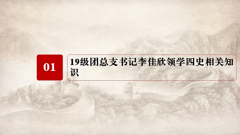 本次理论学习会由21级团总支书记游凌云同学主持。会议伊始,19级团总支书记李佳欣带领全体参会人员深入学习“四史”,帮助我们牢记共产党人的初心使命。
