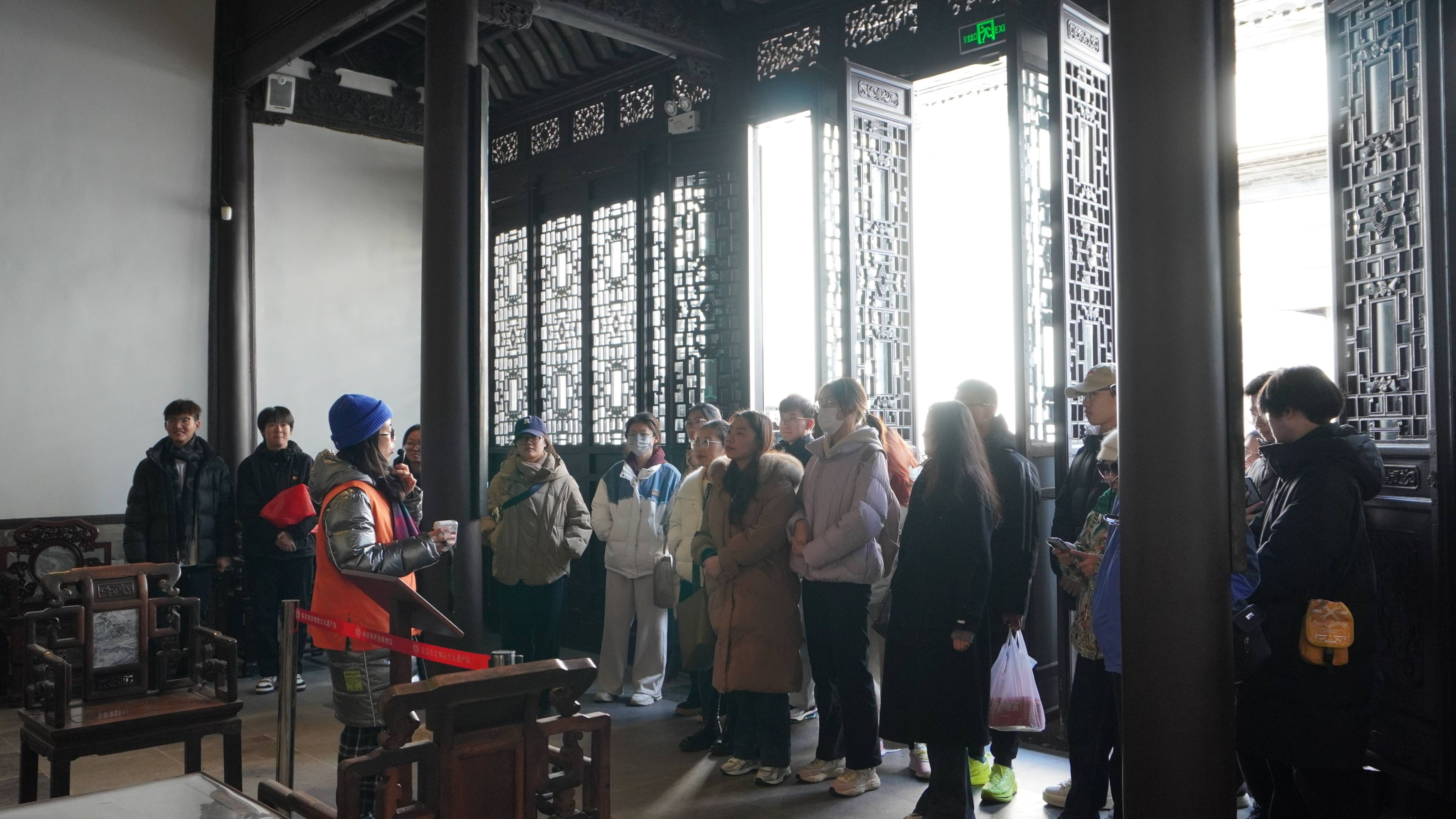 走进南京市民俗博物馆,在讲解员的引领下,同学们深入了解了甘熙宅第的建筑群组空间布局、风格特征、家族历史和家风家训。接着沿路观摩学习了展览馆内南京绒花、南京剪纸、南京云锦、秦淮灯彩、南京木雕等丰富多彩的民俗工艺。活动过程中,同学们还近距离与非遗传承人交流,体会传统工艺背后独具匠心的巧思和智慧,感受他们对传统工艺的热爱和精益求精的执着追求。