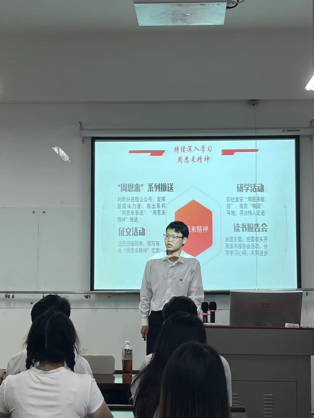 化工(英才)2002班班长储洋做了“精神力量无穷,集体力量巨大”的主题报告。详细介绍班级集体所获荣誉奖项和班级同学在科研方面的成绩,充分展现了“周恩来班”的精神风貌,还分享了“周恩来班”建设经验。