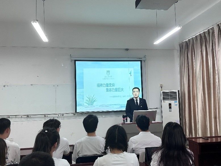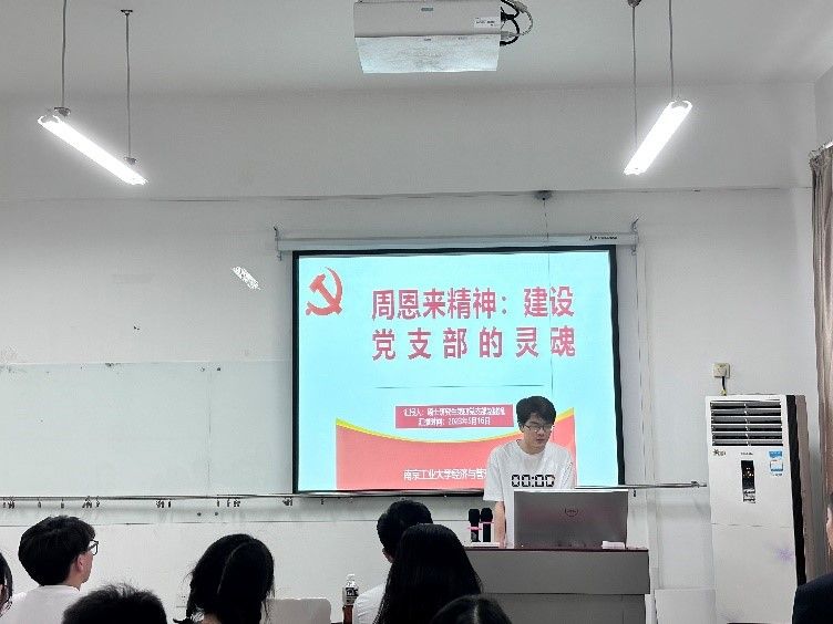 硕士研究生第四党支部书记赵健胤作了“周恩来精神:建设党支部灵魂”宣讲,介绍了周恩来总理的生平以及周恩来精神的丰富内涵,带领在座同学在周总理足迹中汲取进取力量。