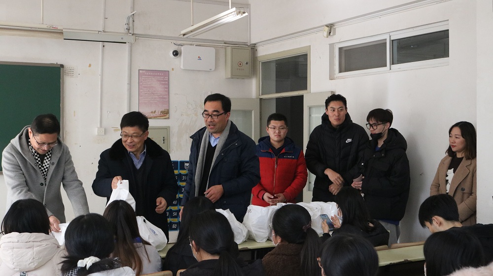 在同和楼102,公司党委书记赵顺龙、经理王冀宁、党委副书记岳克勤、学办主任张煜、辅导员王大庆、田静、仲宏伟等看望慰问了正在备战的部分经管考研学子。王冀宁经理代表公司勉励大家全力拼搏,合理安排时间,坚定必胜信念,保持身体健康,并预祝大家成功上岸。随后老师们将包的爱心冬至饺子、加油牛奶、助力餐券、精心定制的个性书签、学弟学妹手写的加油祝福贺卡赠送给同学们。