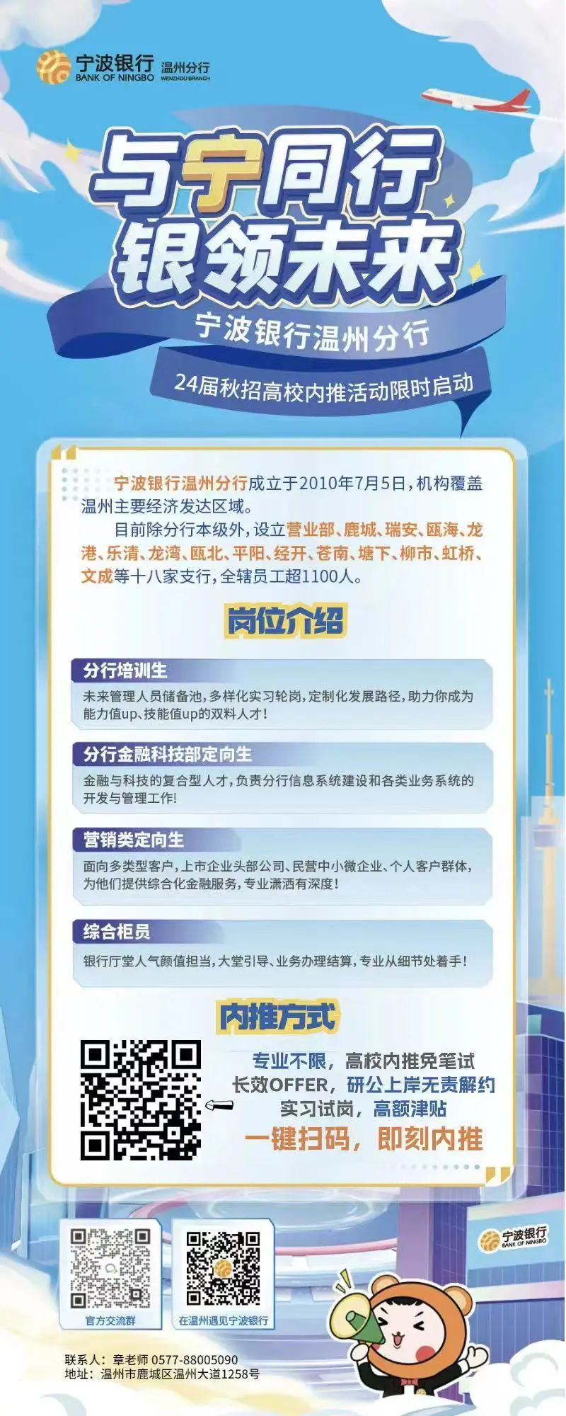 【2024职向未来】宁波银行温州分行24届秋招高校内推活动限时启动